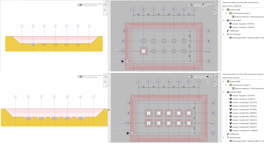 - Unbegrenzte Anzahl an unterschiedlichen Gründungsniveaus in einem Modell abbilden – ideal bei Bauwerken mit variierenden Tiefen, z. B. für kombinierte Tiefgaragen, Aufzugsschächte oder technische Untergeschosse.